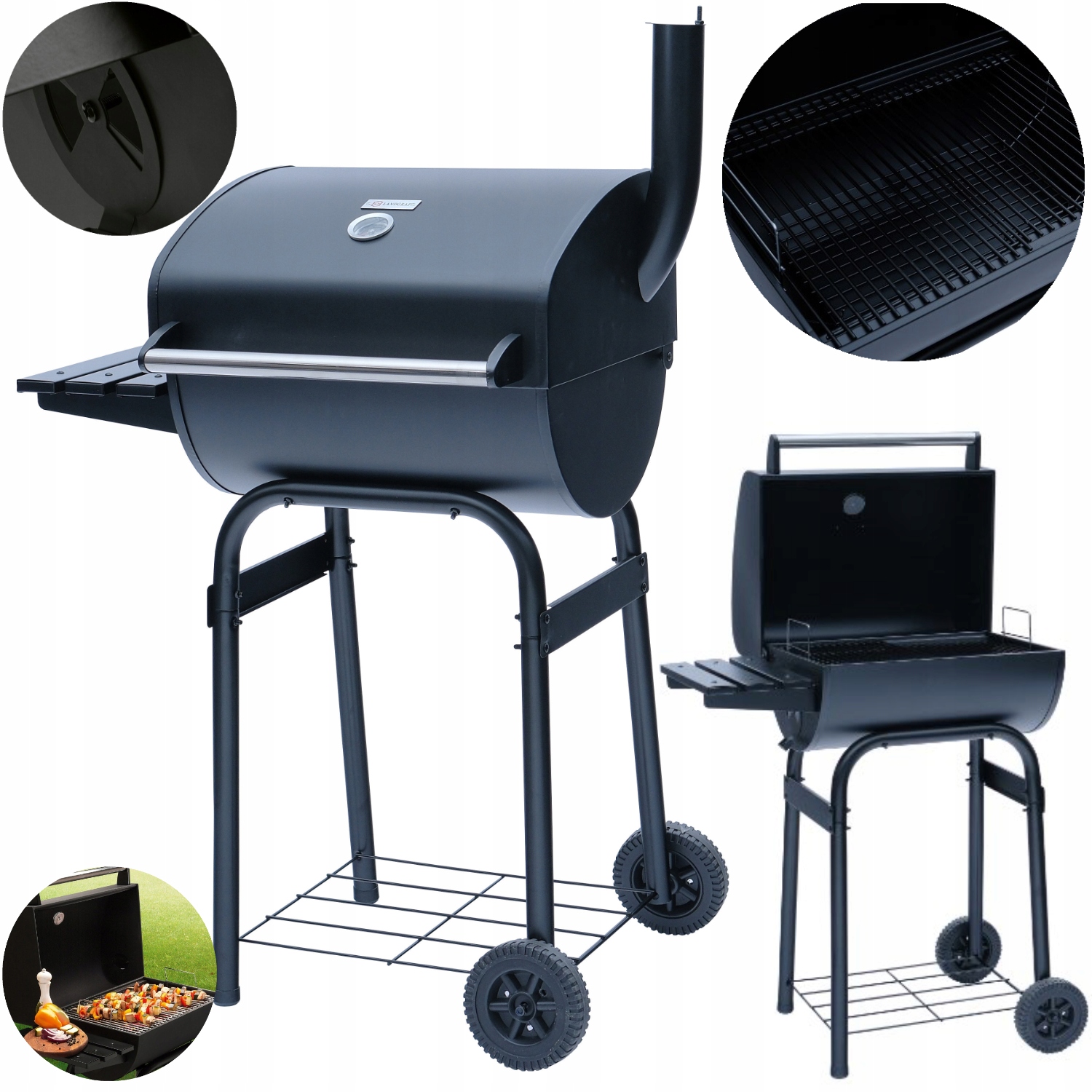 DUŻY GRILL OGRODOWY LANDGRAF + PÓŁKI + POPIELNIK Cechy dodatkowe kółka pokrywa półka popielnik termometr